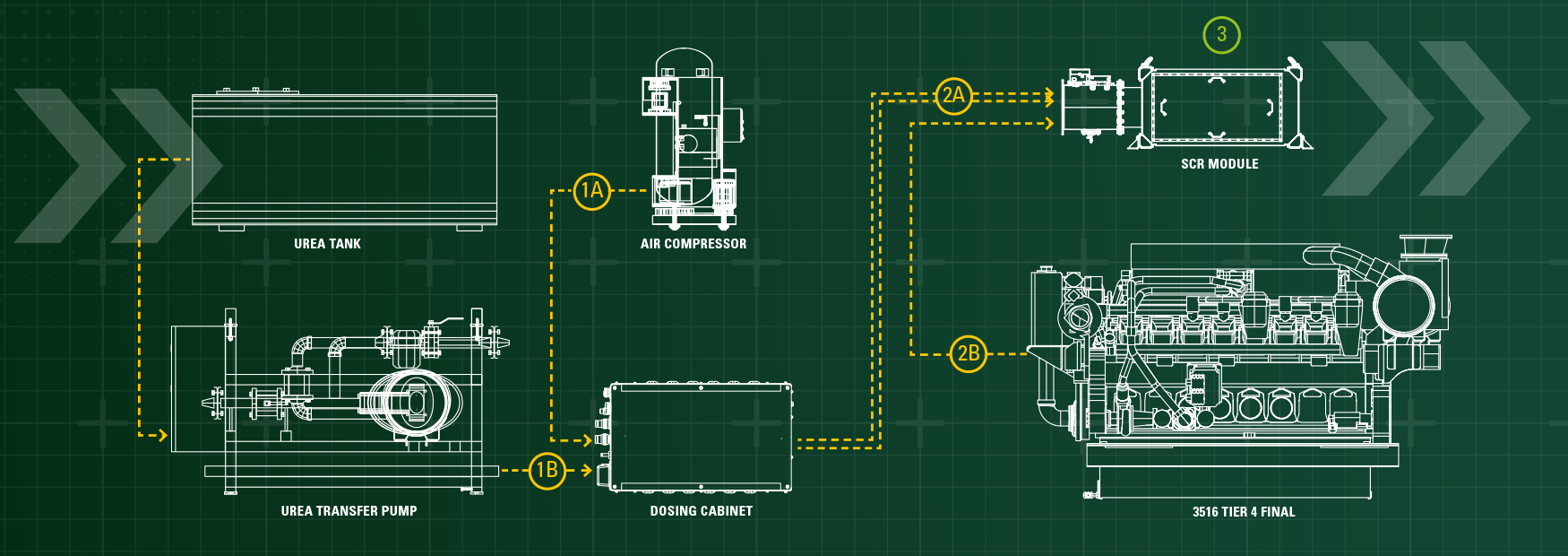 The SCR operation starts at the dosing cabinet, where the correct dose of compressed air [1A] and urea [1B] is mixed. This mixture is sourced from the onboard urea tank and then transferred [2A] to the SCR module.